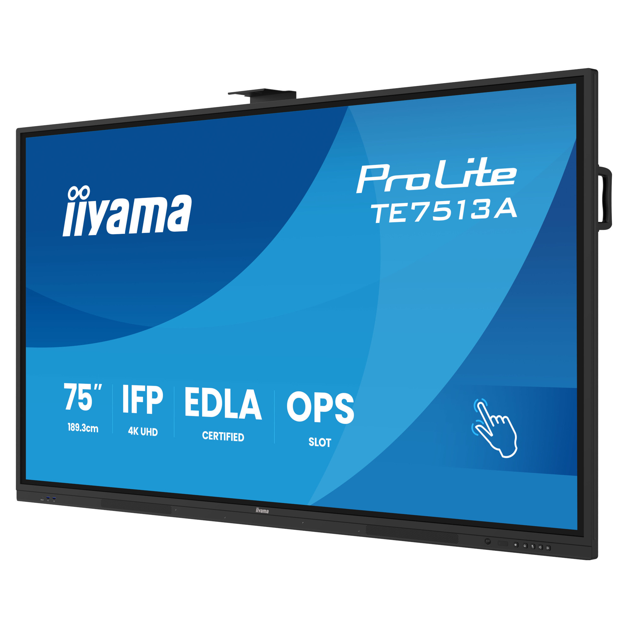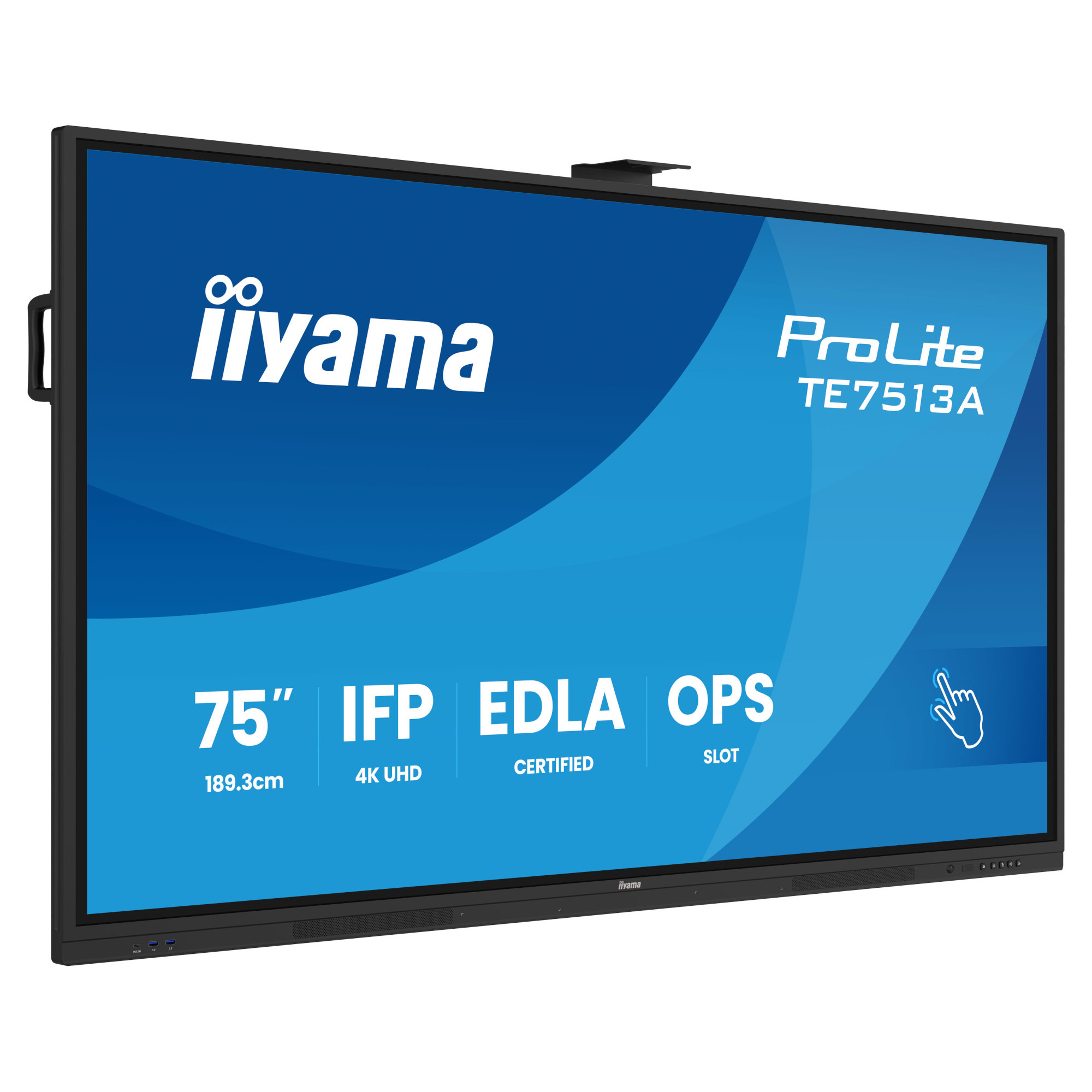 Дисплей IIYAMA TE7513A-B1AG, 75'' IPS panel, Google EDLA, AG, UHD 3840x2160, 450cd/m2, 1200:1, 8ms, PureTouch-IR+, Android 14, iiWare 21E, iiControl, Quick Radial Menu, 2x HDMI, DP, 2x USB-C, 2x LAN, 3x USB, RS232C, HDMI out, Speakers, WiFi-6, BT, Quad Core A73, 8GB, 128GB, OPS slot, Black